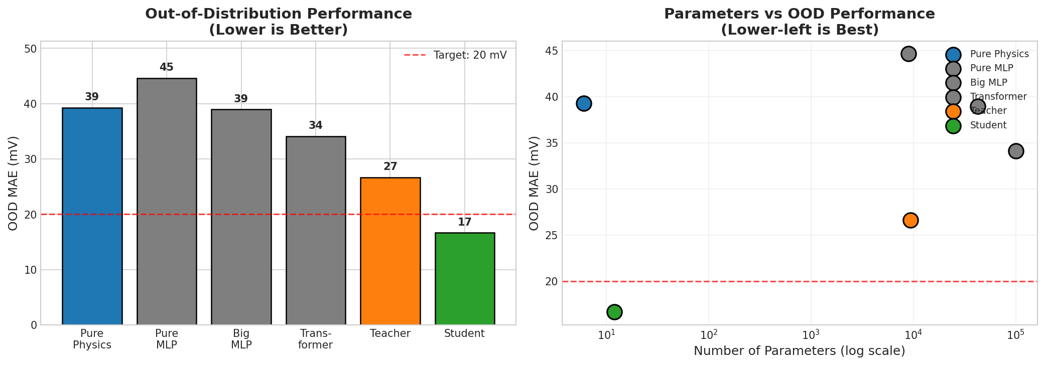 Left: Out-of-distribution performance (lower is better). The 12-parameter student (17 mV) beats all neural networks. Right: Parameters vs OOD accuracy — the student sits in the ideal lower-left corner.