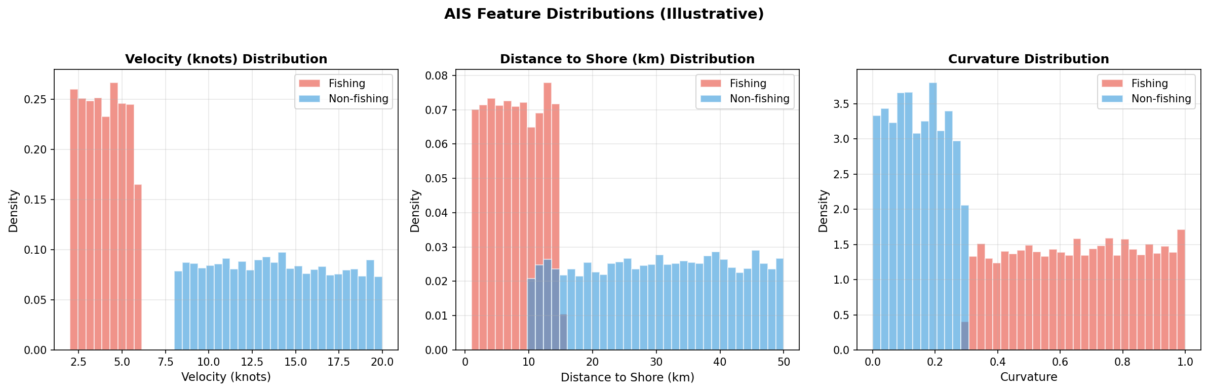 Distribution of the three features for fishing (orange) and non-fishing (blue) vessel trajectories. Fishing vessels show lower, more variable speeds; closer proximity to shore; and higher trajectory curvature.