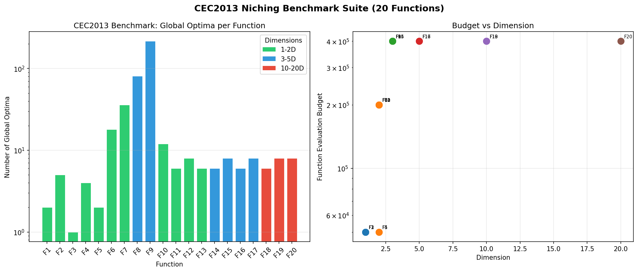The CEC2013 suite spans 20 functions from 1D to 20D, with 1 to 216 global optima. Colors indicate dimensionality: green (1-2D), blue (3-5D), red (10-20D).