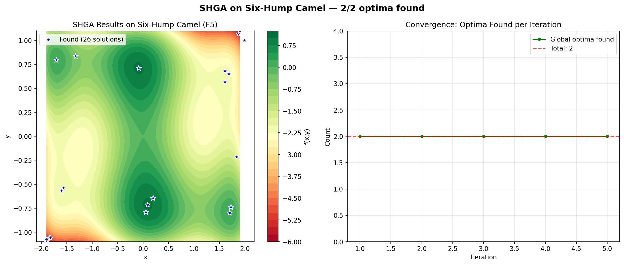 SHGA on the Six-Hump Camel (F5) — both global optima found with rapid convergence.