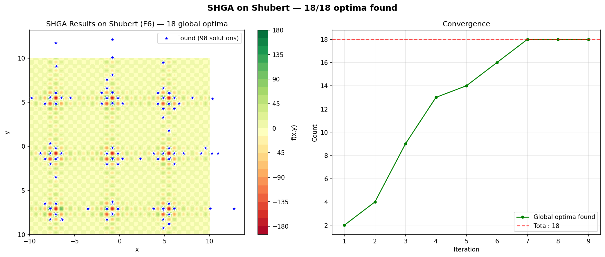 SHGA on the Shubert function (F6) — the algorithm must find 18 global optima scattered across a complex landscape with 760 local optima.